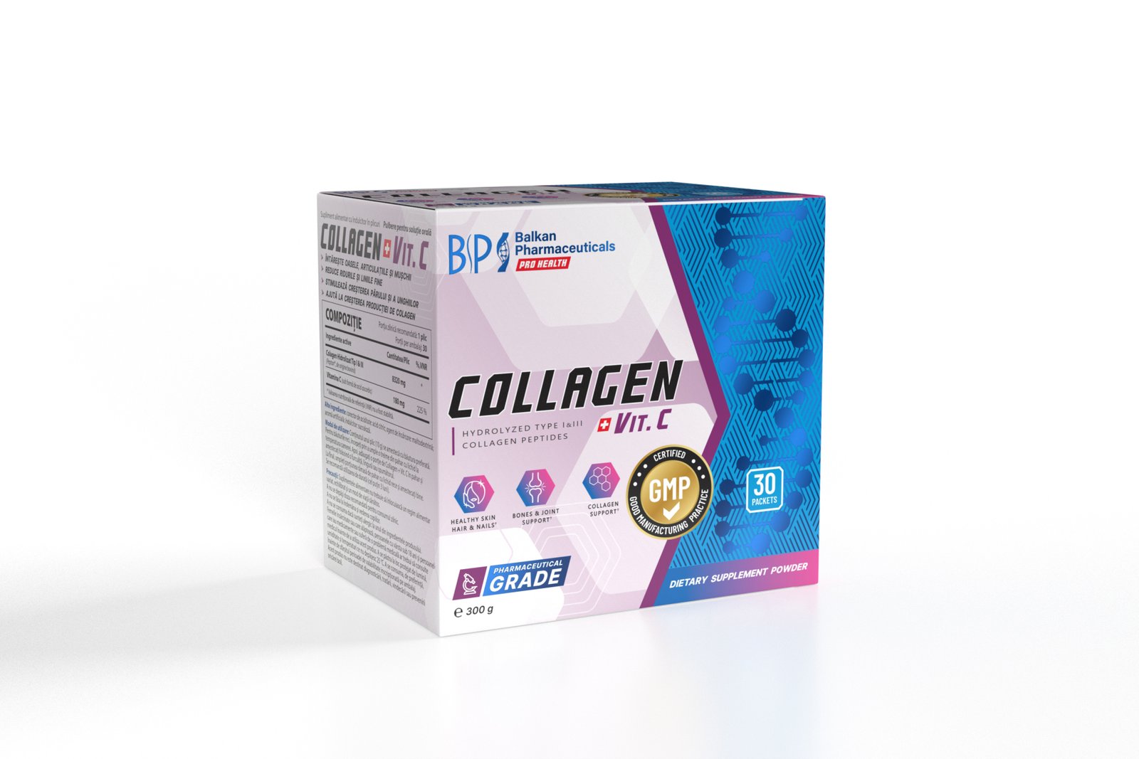Kolagen + Witamina C — suplement diety w formie proszku do roztworu doustnego, dostępny w 30 saszetkach, każda o wadze 10 g.