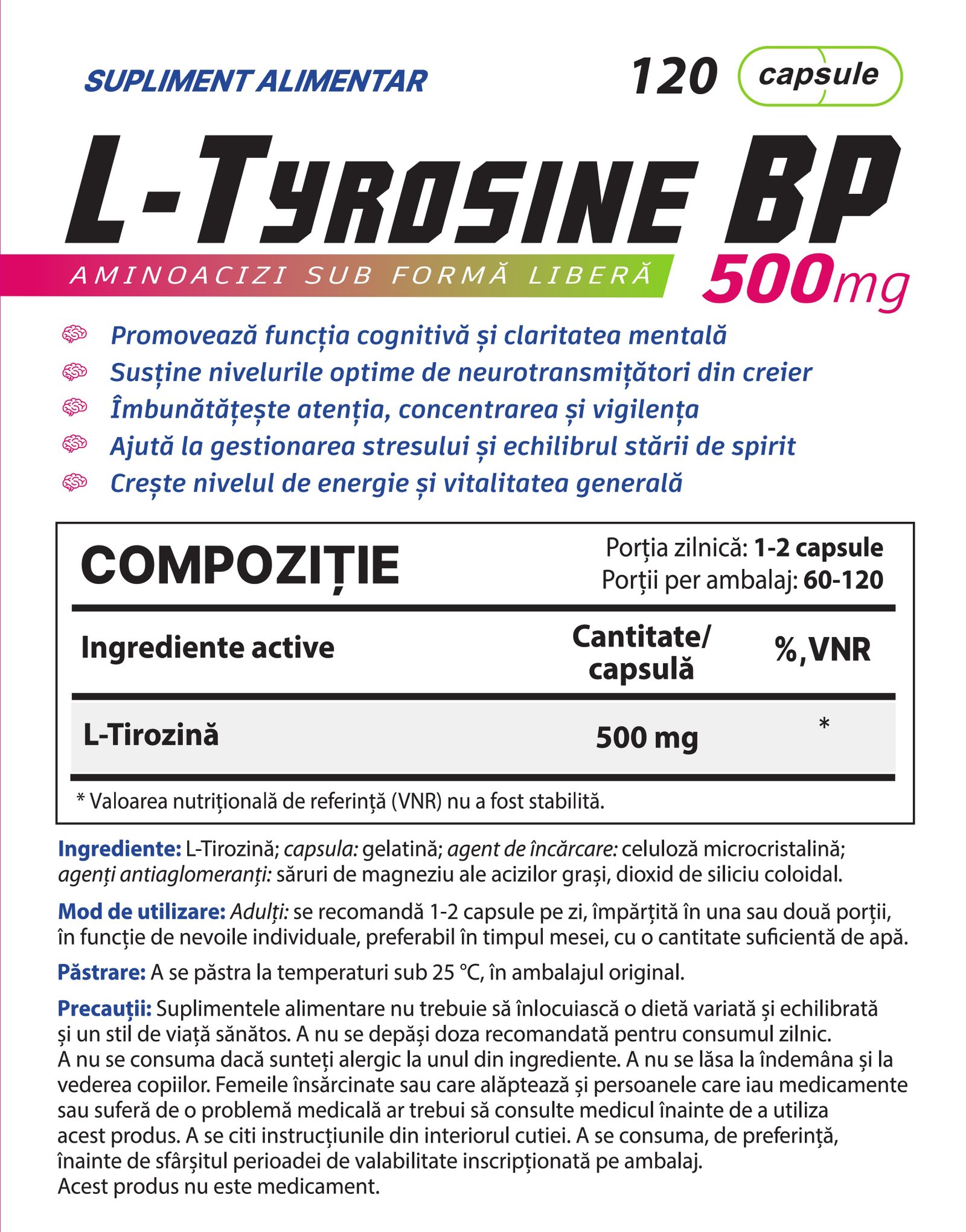 Active ingredient: L-Tyrosine (500 mg per capsule)