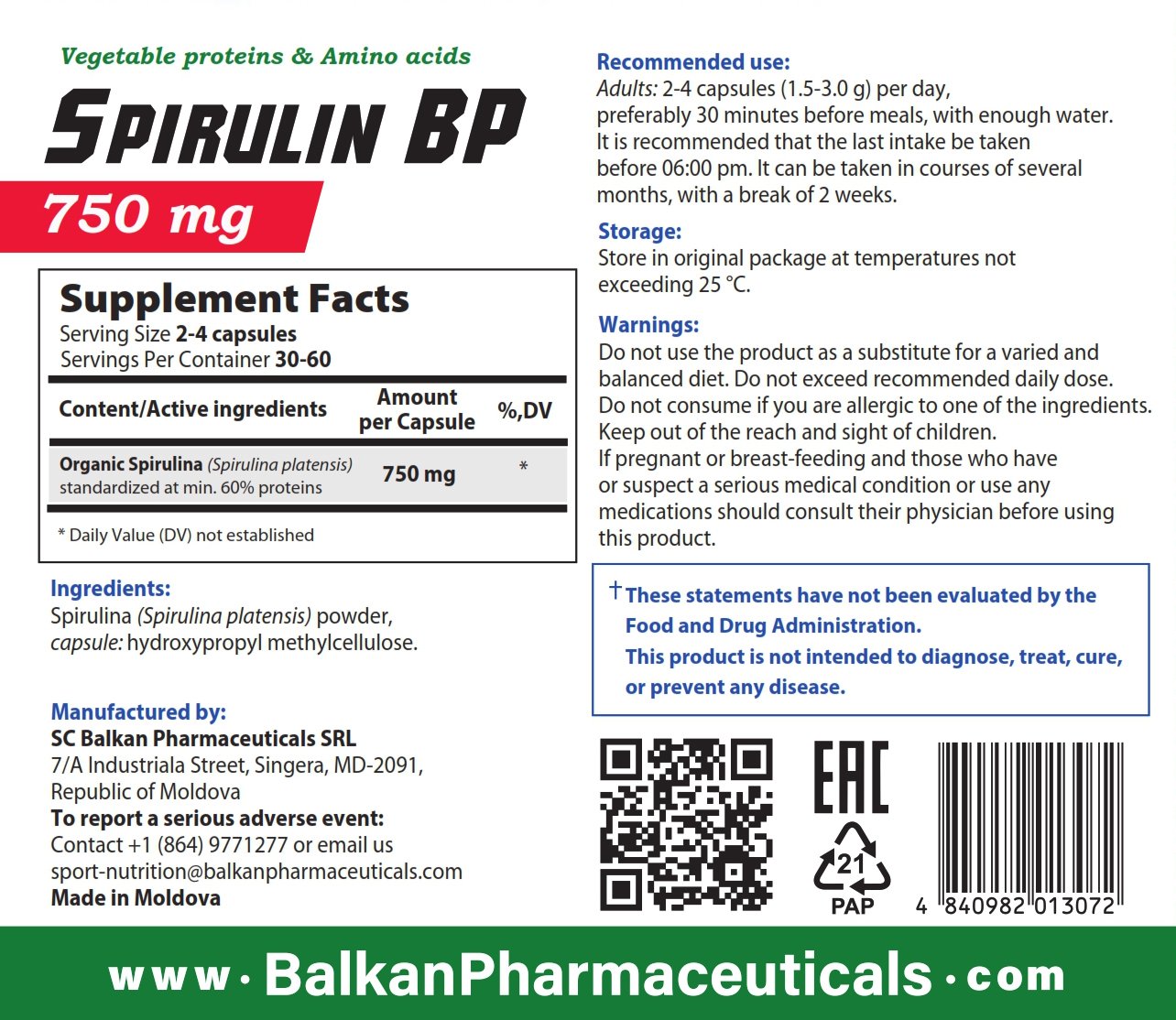 The active ingredient in the composition is Spirulina (Spirulina platensis), standardized to an impressive minimum content of 60% protein.