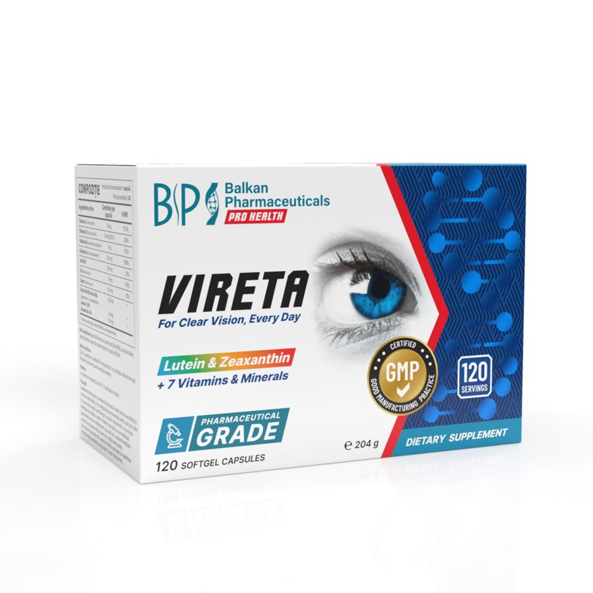 Vireta is an advanced formula developed by ophthalmologists and scientists to support and maintain healthy vision. Each capsule delivers 2.5 mg of Lutein and 0.5 mg of Zeaxanthin, essential macular carotenoids that protect the eyes from sunlight and oxidative stress. Combined with vitamins B12, B5, C, E, zinc, copper, and folic acid, Vireta helps reduce eye fatigue, dryness, and age-related degeneration, while improving ocular blood circulation and overall eye health. All these benefits are provided in just 2 easy-to-take capsules daily.